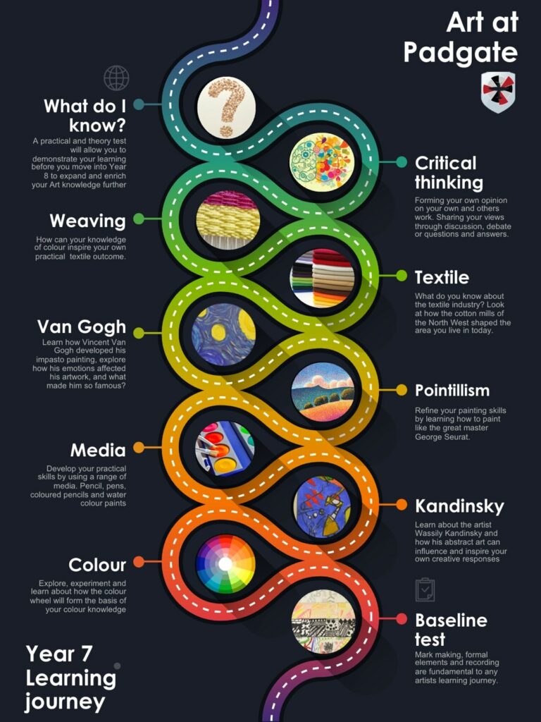 The Art curriculum has been designed to build on 6 threshold concepts (see below) this is the basis for the sequence of the learning and unlocking to each learning theme. Students will have the opportunity to engage with and critically evaluate the works of others (including the history of art).