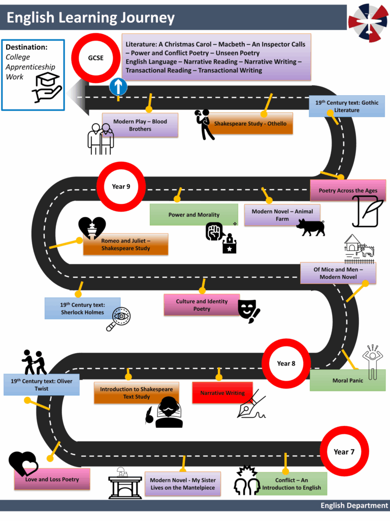 Our purpose in the English department is to implement a high-quality knowledge-rich curriculum that is delivered through high-quality teaching and student engagement. We seek to empower our students through the explicit and focused teaching of a wide repertoire of sophisticated and ambitious vocabulary. We will ensure an academic exploration of powerful knowledge with a focus on retention and application. We will prioritise the meaningful study of the concepts that underpin literature, individuals, society, and the world around us. We seek to inspire the next generation of powerful voices. Our curriculum is broad in that we cover a range of whole texts whilst also exploring the best that has been written and said through a wide range of extracts and poems.